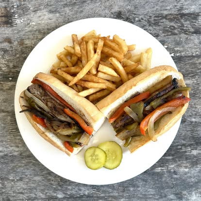 sweet and hot peppers, fried onions, marinara sauce, and melted cheese